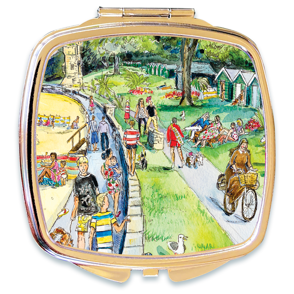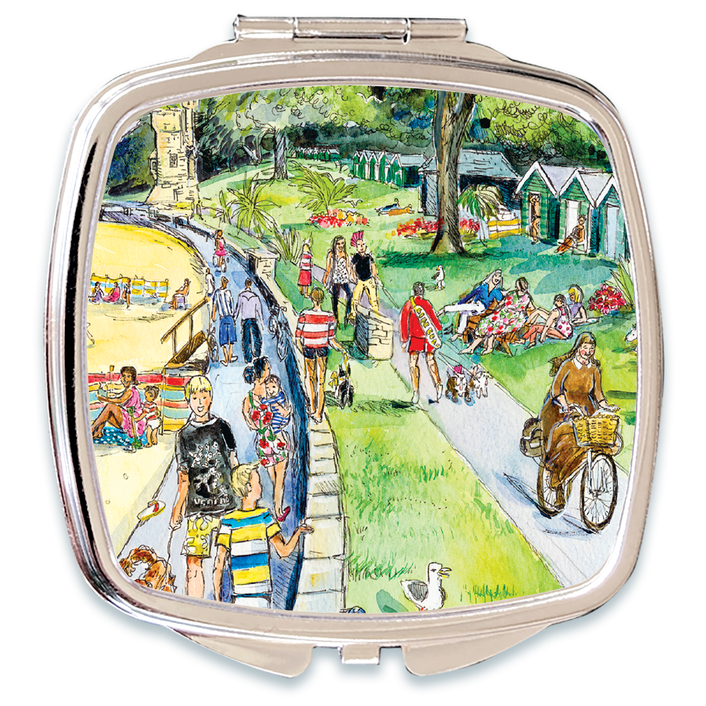 Beautifully printed solid square metal compact case with curved corners and dressing mirror inside measuring 75 x 65 x 8mm