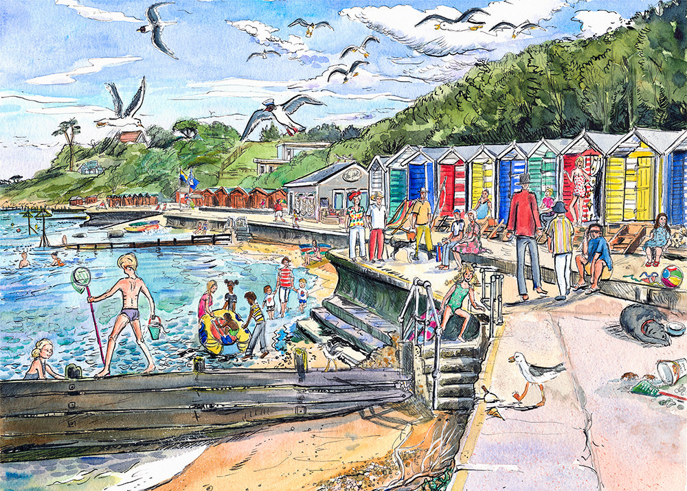 The man was still painting the huts when I drew this, I love the choice of colours and the stripes it is really fun. This is drawn with a dip pen.