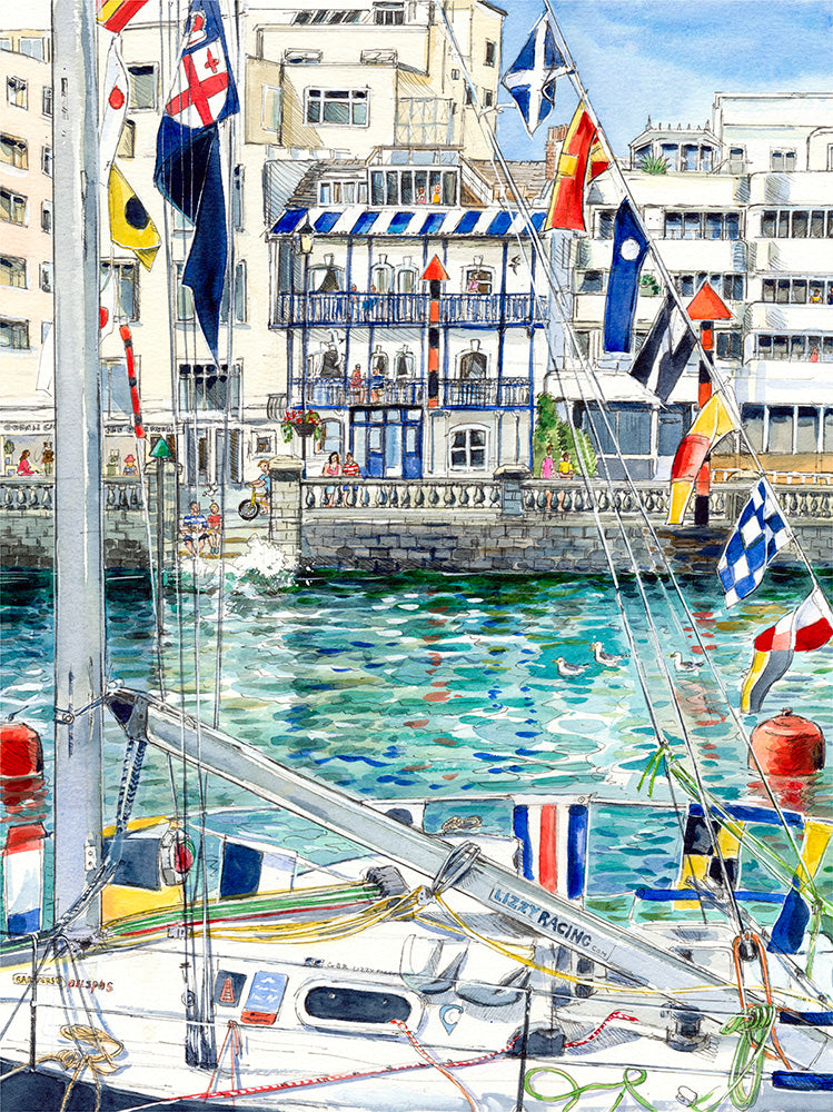 It was a beautiful sparkly morning when I sketched this, I had a bit of time to waste in Cowes between appointments and I was really pleased when I saw the Lizzy racing boat moored up in front of the R.L.Y.C. The flags made for a fun vibrant painting.