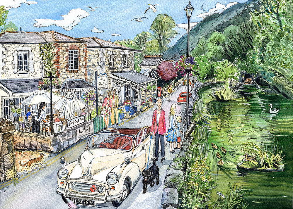 I sketched this on an incredibly hot day and strangely for Bonchurch there wasn't a lot of shade. The bamboo had to be reduced a bit to see the pond and it took a lot of guts to actually paint it the lush bright green colour it was. The ornate wooden boards on the shop were a bit tricky.