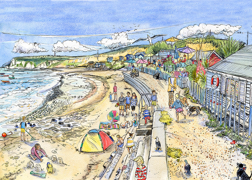 This is a lovely stretch of beach between The Crab and Lobster Inn in Bembridge and Whitecliff bay. There are some really unique beach huts wedged into to the cliffs and one of my favourites is painted in primary colours like a Mondrian painting. I would recommend going at low tide as the rock formations are quite interesting patterns and I have tried to show a bit of this in the work.