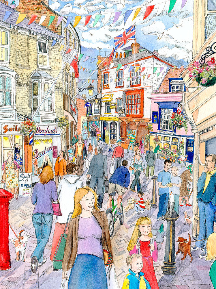 The only way to do a good High Street scene is to stand on location and just do it, whilst sketching I keep an eye out for people to add in but I also make a few up.